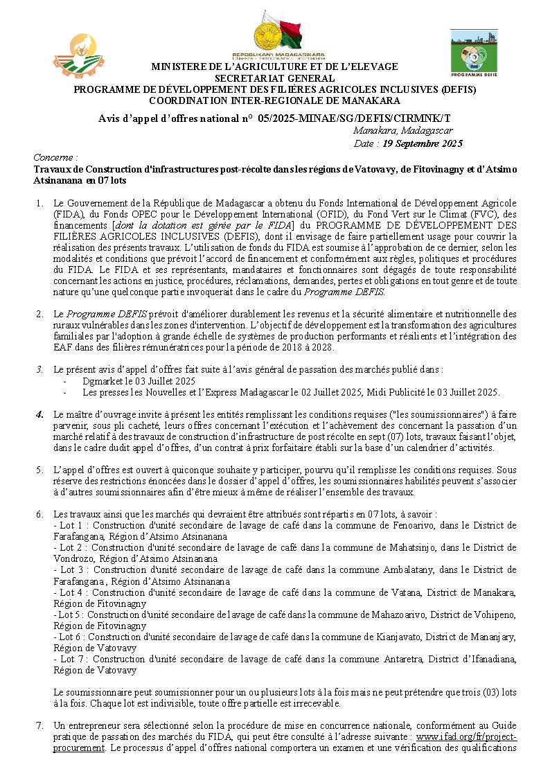 Construction d’infrastructures post-récolte dans les régions de Vatovavy, Fitovinagny et Atsimo Atsinanana, répartis en 7 lots :