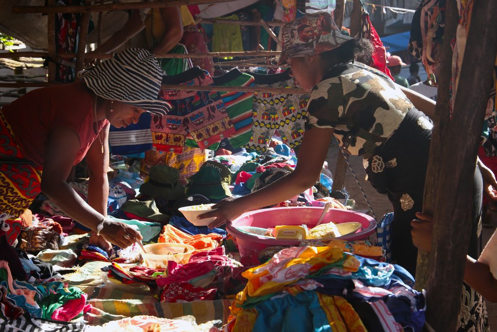 Bezo et Anitha s'entraident pour vendre leurs plats composés au petit marché hebdomadaire de Marofarihy