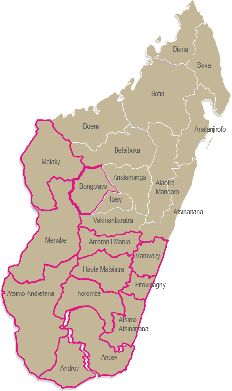 Le Programme va intervenir dans six régions fortement exposées à un risque élevé d’insécurité alimentaire (Androy, Atsimo–Andrefana, Anosy, Atsimo–Atsinanana, Vatovavy et Fitovinany), trois régions à l’ouest (Bongolava, Melaky et Menabe) et trois autres dans les hauts plateaux centraux (Ihorombe, Haute Matsiatra et Amoron’i Mania) à fort taux de pauvreté.
