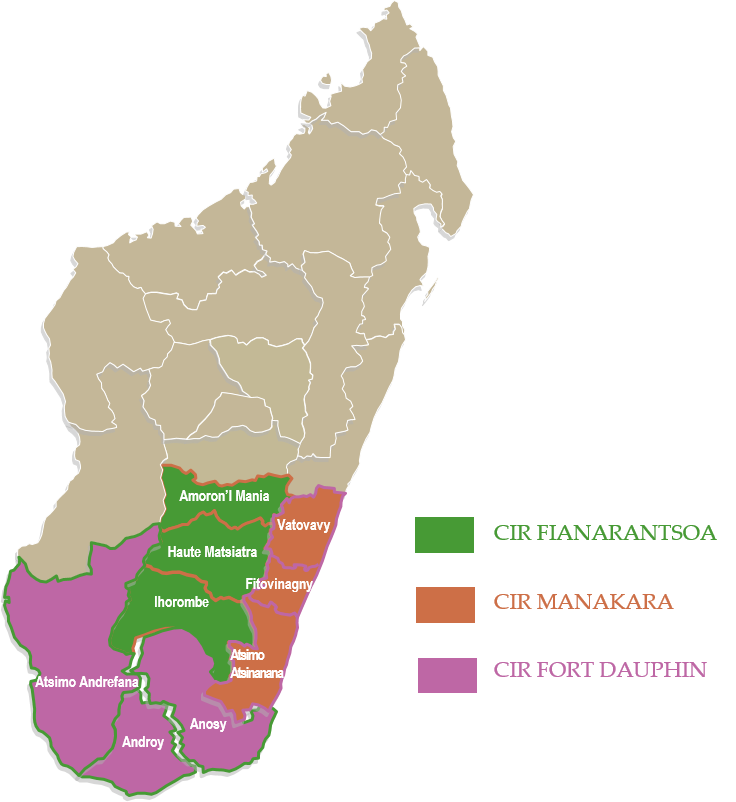 | Amoron’i Mania, Haute Matsiatra, Ihorombe | Bemahazemona, Fisakana, Akona-Ihadilalana, Imadiala, Matsiatra Avaratra, Matsiatra Andrefana, Fianarantsoa, Vohibato, Ambalavao, Ivohibe-Iakora, Ambavan’Ihosy, Tampon’Ihorombe | Riz, Maïs, Miel, Manioc, Café, Oignon, Arachide |