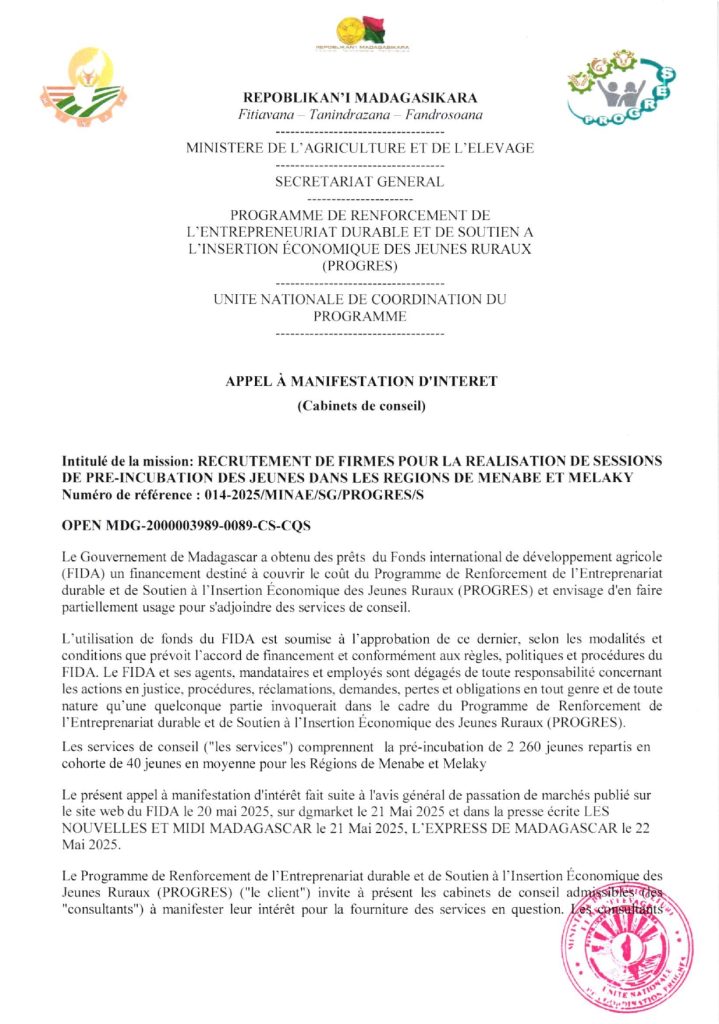 Soumission des dossiers : Bureau du Programme PROGRES – Immeuble FOFIFA Ampandrianomby, 1er étage, porte 107, Antananarivo, OU Bureau UFR PROGRES Morondava – Enceinte de l’ex-bâtiment HASYMA, Tsimavaokely