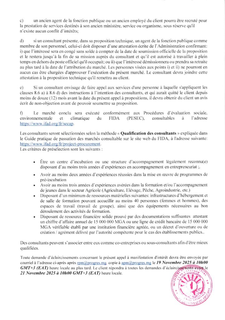 Demandes d’éclaircissements : par courriel à rpm@progres.mg, avec copie à apm@progres.mg, avant le 19 novembre 2025 à 10h00 (heure locale)