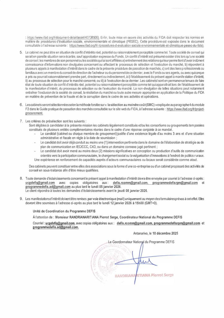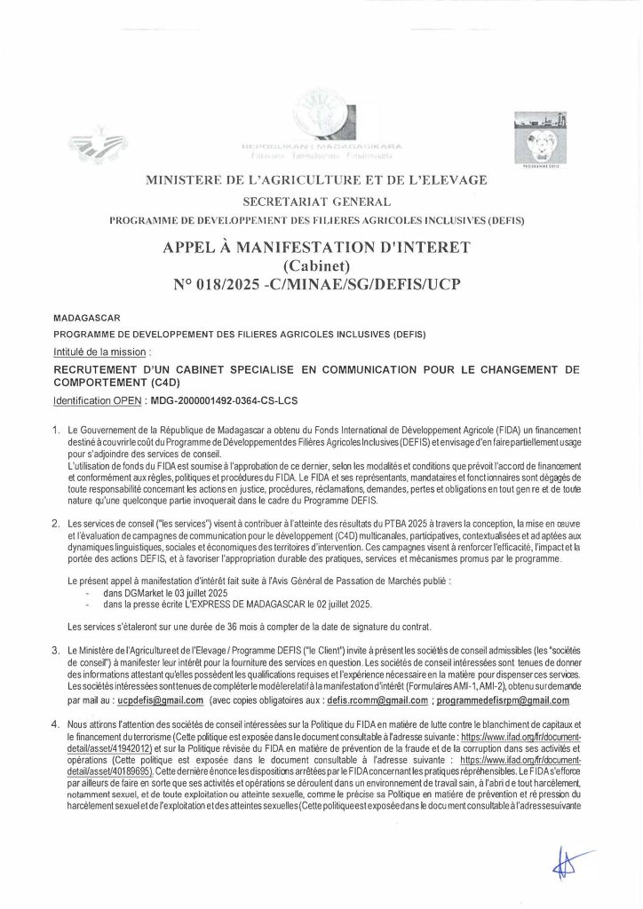 Le Programme DEFIS (MINAE/FIDA) lance un appel à candidature pour le recrutement d’un CABINET SPÉCIALISÉ EN COMMUNICATION POUR LE DEVELOPPEMENT (C4D)