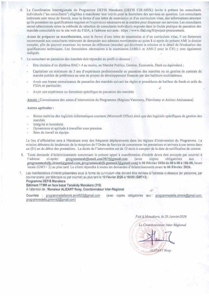 Le Programme de Développement des Filières Agricoles Inclusives (DEFIS), financé par le FIDA et sous tutelle du MINAE , lance un appel à manifestation d’intérêt pour le recrutement d’un(e) Consultant(e) individuel(le) en Passation de marchés, basé(e) à Manakara.